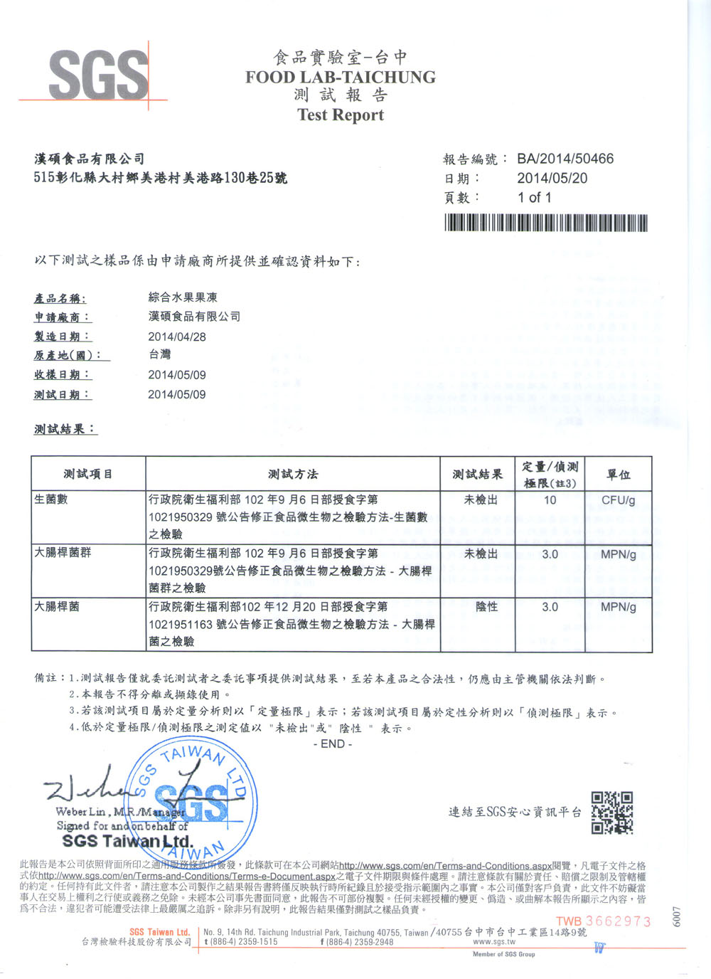 SGS檢驗報告 綜合水果果凍中文檢驗報告 2014/5/20