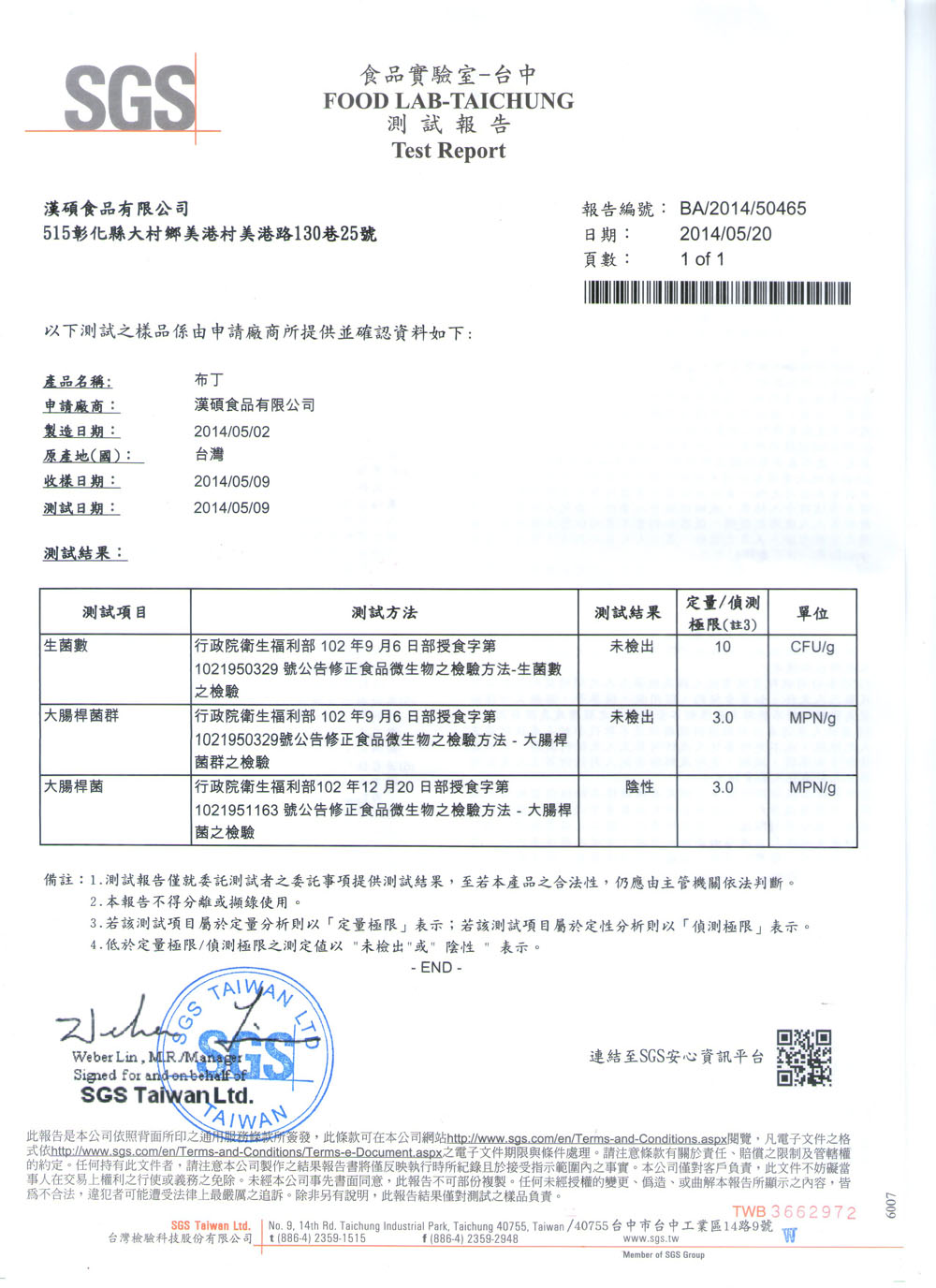 SGS檢驗報告 布丁中文檢驗報告 2014/5/20